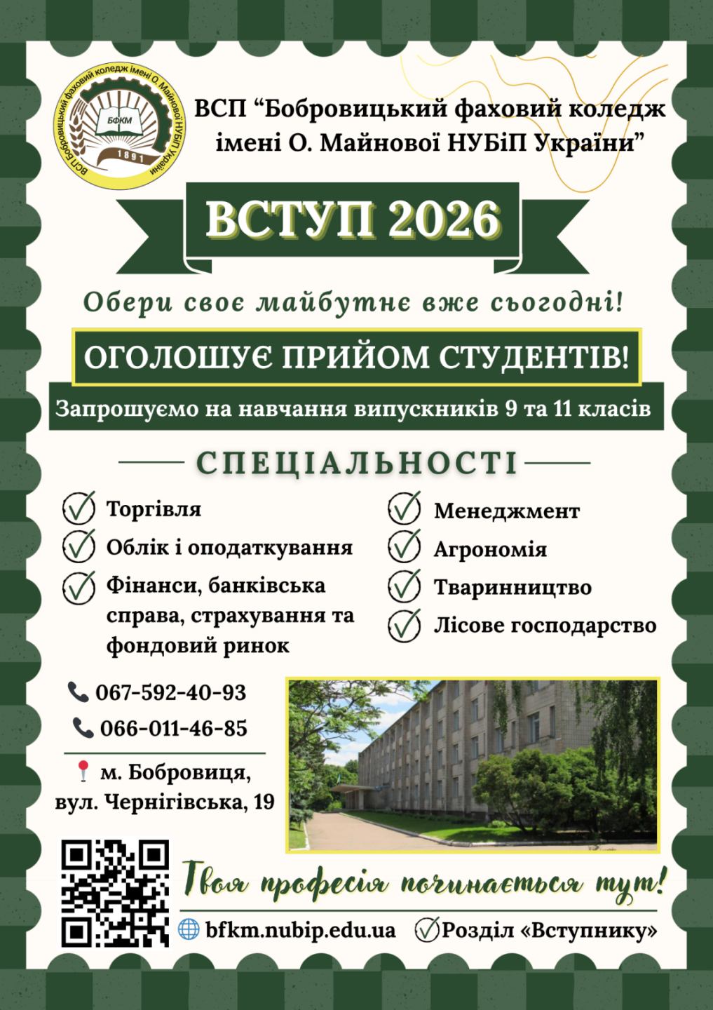 Формування якісного контингенту студентів є одним із ключових завдань ВСП «Бобровицький фаховий коледж імені О. Майнової НУБіП України», тому велика увага приділяється цілеспрямованій профорієнтаційній роботі серед учнів закладів загальної середньої освіти. Успішний професійний вибір значною мірою визначає подальшу трудову діяльність, рівень добробуту громадянина, сприяє розкриттю особистісного потенціалу, а для держави — забезпечує ефективну віддачу інвестицій в освіту.